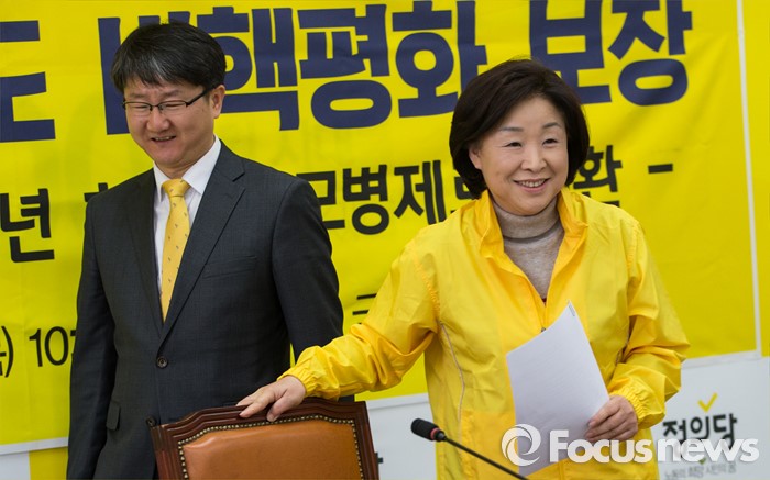 (서울=포커스뉴스) 심상정 정의당 상임대표(오른쪽)가 17일 오전 서울 여의도 국회에서 국방정책기조 및 대표공약 발표 기자회견을 하기 위해 회견장을 들어서고 있다.