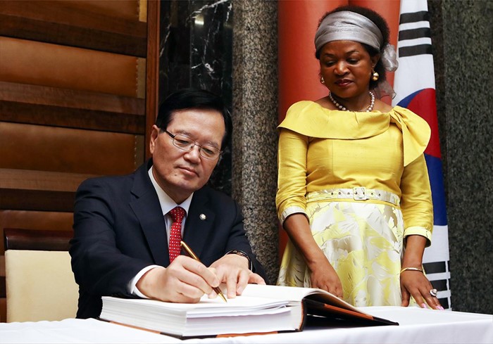 (서울=포커스뉴스) 정의화 국회의장이 16일 오후(현지시각) 남아프리카공화국 의회를 방문해 방명록을 작성하고 있다. 오른쪽은 발레카 음베테(Baleka Mbete) 남아공 의회 하원의장. 정 의장은 원전과 해양, ICT 산업 등의 분야에서 한국 기업의 남아공 진출과 투자확대를 위한 지원을 요청했다. <사진제공=국회>