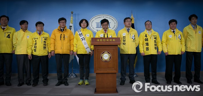 (서울=포커스뉴스) 박원석(오른쪽 다섯번째) 정의당 경기도당위원장과 예비후보들이 17일 오전 서울 여의도 국회 정론관에서 야권연대 관련 기자회견을 하고 있다.