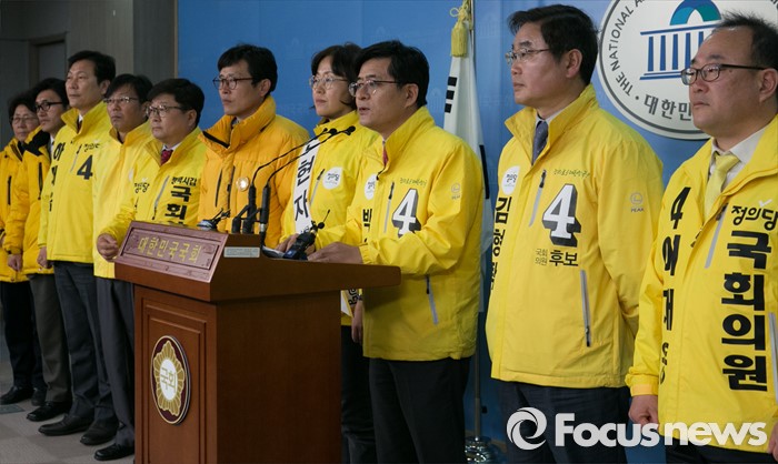 (서울=포커스뉴스) 박원석(오른쪽 세번째) 정의당 경기도당위원장과 예비후보들이 17일 오전 서울 여의도 국회 정론관에서 야권연대 관련 기자회견을 하고 있다.