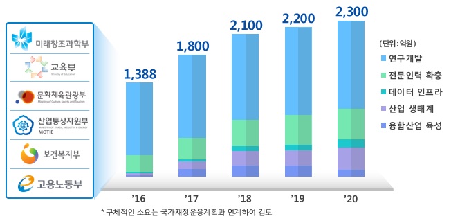 이날 정부는 범 부처에서 향후 5년간 지능정보산업에 5년 간 1조원을 투자한다고 발표했다. 구체적인 투자금액은 올해 1388억원, 내년 1800억원, 2018년 2100억원, 2019년 2200억원, 2020년 2300억원 등이다. 이를 마중물 삼아 같은 기간 민간 투자는 2조5000억원 이상 유도한다는 계획이다.