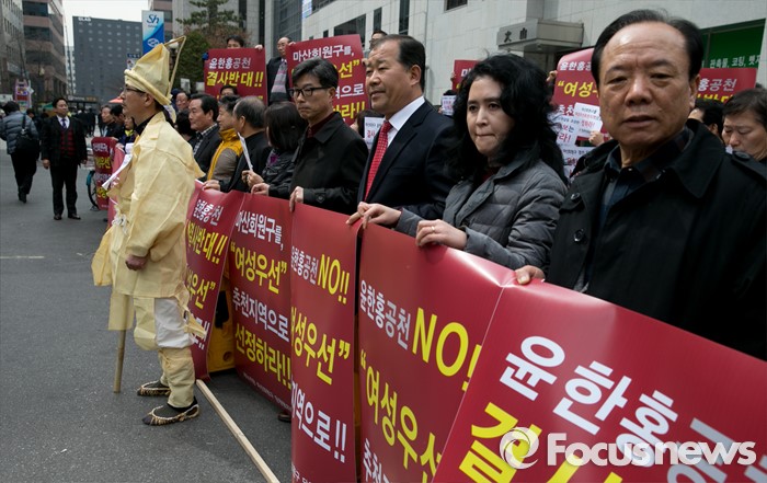 (서울=포커스뉴스) 17일 오후 서울 여의도 새누리당사 앞에서 경남 창원 마산회원구 지역 당원들이 경선을 통해 공천된 윤한홍 예비후보 반대 및 여성우선 공천을 촉구하는 집회를 하고 있다.