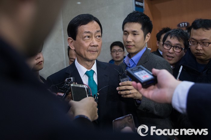 (서울=포커스뉴스) 공천에서 배제 된 새누리당 3선 중진 진영 의원이 17일 오후 서울 여의도 국회 정론관에서 탈당 기자회견 마친 후 기자들의 질문을 받고 있다.