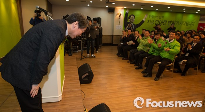 (청주=포커스뉴스) 17일 오후 충북 청주 흥덕구 리호관광호텔에서 열린 국민의당 충북도당 창당대회에서 안철수 공동대표가 당원들에게 인사를 하고 있다.