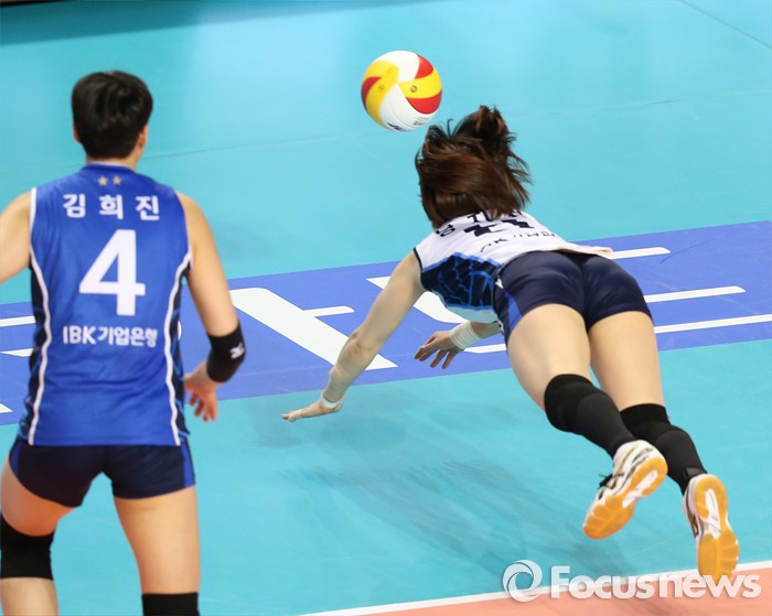 (화성=포커스뉴스) 17일 화성실내체육관에서 열린 2015-2016 V-리그 여자부 챔피언결정전 1차전 IBK기업은행-현대건설 경기에서 IBK기업은행 리베로 남지연이 아웃되는 볼을 살리려고 다이빙하고 있다.