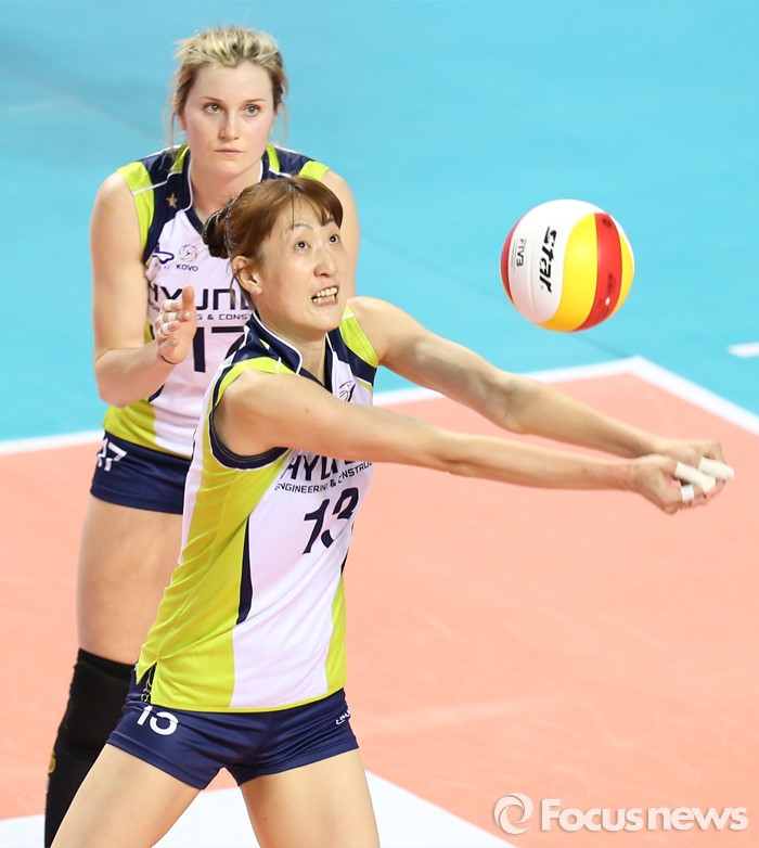 (화성=포커스뉴스) 17일 화성실내체육관에서 열린 2015-2016 V-리그 여자부 챔피언결정전 1차전 IBK기업은행-현대건설 경기에서 현대건설 김세영이 블로킹에 맞고 튄공을 띄워 올리고 있다.