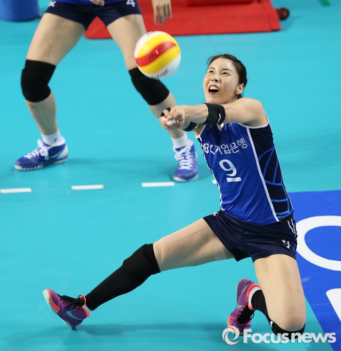(화성=포커스뉴스) 17일 화성실내체육관에서 열린 2015-2016 V-리그 여자부 챔피언결정전 1차전 IBK기업은행-현대건설 경기에서 IBK기업은행 김사니가 블로킹에 맞고 튄공을 살려내고 있다.