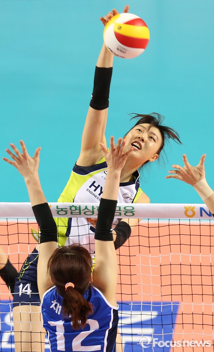 (화성=포커스뉴스) 17일 화성실내체육관에서 열린 2015-2016 V-리그 여자부 챔피언결정전 1차전 IBK기업은행-현대건설 경기에서 현대건설 양효진이 높은 타점으로 IBK기업은행 채선아와 김유리의 블로킹을 뚫는 스파이크를 넣고 있다.