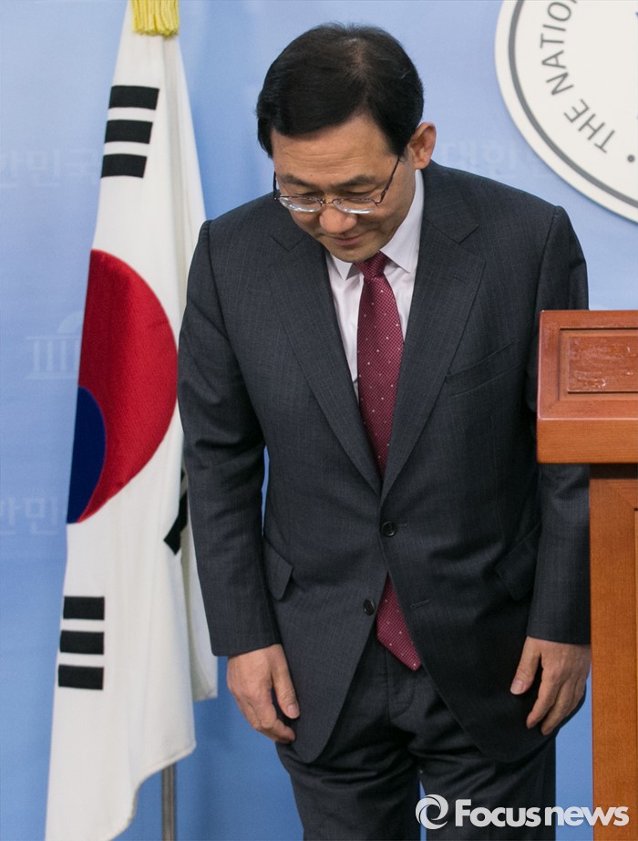 (서울=포커스뉴스) 공천 탈락한 주호영 새누리당 의원이 18일 오전 서울 여의도 국회 정론관에서 최고위원회의 재심 요구를 반려한 이한구 공천관리위원장과 관련 기자회견에 앞서 인사하고 있다.