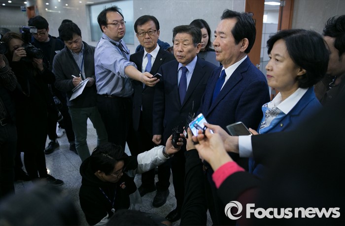 (서울=포커스뉴스) 더불어민주당 중진 의원들이 18일 오전 서울 여의도 국회 정론관에서 수도권 중심 야권 연대를 촉구하는 기자회견을 마친 뒤 취재진 질문에 답하고 있다. 왼쪽부터 원혜영, 유인태, 정세균, 추미애 의원.