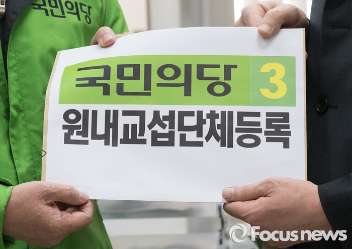 (서울=포커스뉴스) 18일 오전 서울 여의도 국회에서 국민의당 김영환(왼쪽부터) 인재영입위원장, 주승용 원내대표, 장병완 정책위의장이 국회의사국 관계자에게 원내교섭단체등록서를 제출하고 있다.