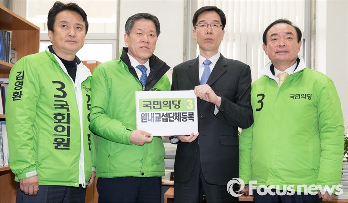 (서울=포커스뉴스) 18일 오전 서울 여의도 국회에서 국민의당 김영환(왼쪽부터) 인재영입위원장, 주승용 원내대표, 장병완 정책위의장이 국회의사국 관계자에게 원내교섭단체등록서를 제출하고 있다.