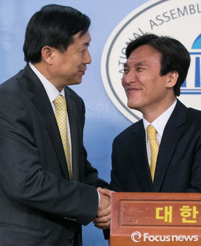 (서울=포커스뉴스) 더불어민주당을 탈당한 신기남(왼쪽) 의원이 18일 오전 서울 여의도 국회 정론관에서 원외 정당인 민주당 입당 기자회견을 마친 뒤 김민석 민주당 대표와 악수하고 있다.