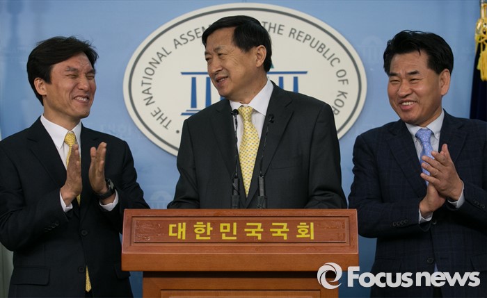 (서울=포커스뉴스) 더불어민주당을 탈당한 신기남(가운데) 의원이 18일 오전 서울 여의도 국회 정론관에서 원외 정당인 민주당 입당 기자회견을 마친 뒤 김민석(왼쪽) 민주당 대표, 강신성 전 대표의 박수를 받고 있다.