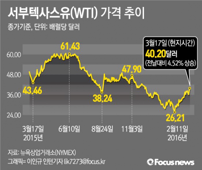 (서울=포커스뉴스) 17일(현지시각) 뉴욕상업거래소(NYMEX)에서 서부텍사스산원유(WTI) 가격은 전날보다 배럴당 1.74달러(4.5%) 오른 40.20달러에 거래를 마쳤다.