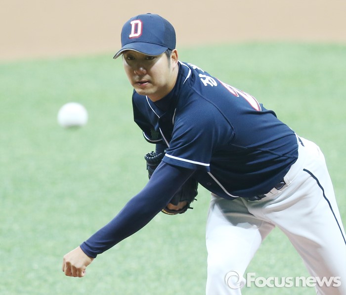 (서울=포커스뉴스) 18일 서울 고척스카이돔에서 열린 2016 프로야구 시범경기 두산-넥센 경기 1회말 두산 선발 장원준이 투구하고 있다.