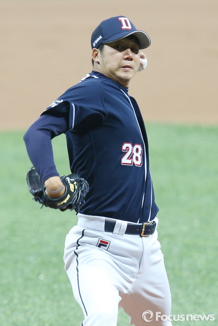 (서울=포커스뉴스) 18일 서울 고척스카이돔에서 열린 2016 프로야구 시범경기 두산-넥센 경기 1회말 두산 선발 장원준이 투구하고 있다.