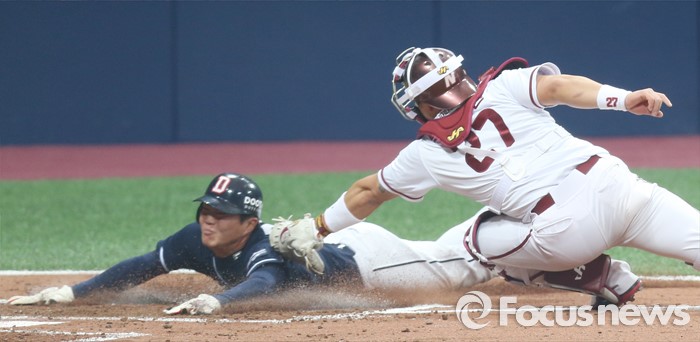 (서울=포커스뉴스) 18일 서울 고척스카이돔에서 열린 2016 프로야구 시범경기 두산-넥센 경기 3회초 2사 1,2루에서 두산 허경민의 중전안타때 2루주자 류지혁이 홈까지 파고들었으나 넥센 중견수 유재신의 정확한 송구로 아웃되고 있다. 넥센 포수는 박동원.