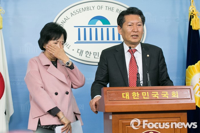 (서울=포커스뉴스) 손혜원(왼쪽) 더불어민주당 홍보위원장이 18일 오후 서울 여의도 국회 정론관에서 출마 기자회견을 마친 뒤, 정청래 의원의 인사말을 경청하고 있다. 한편, 손 위원장이 출마하게 될 서울 마포을 지역구는 공천 배제 된 정 의원 지역구이다.