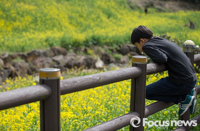(제주=포커스뉴스)19일 오전 제주 서귀포 중문관광단지 일원에서 제18회 서귀포 유채꽃 국제걷기대회가 열리고 있다. 걷기대회에 참가한 한 소년이 엉덩물계곡에서 만개한 유채꽃을 바라보고 있다.