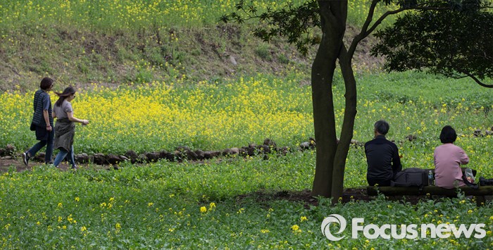 (제주=포커스뉴스)19일 오전 제주 서귀포 중문관광단지 일원에서 제18회 서귀포 유채꽃 국제걷기대회가 열리고 있다. 걷기대회에 참가한 관광객들이 엉덩물계곡 유채꽃길을 걷고 있다.
