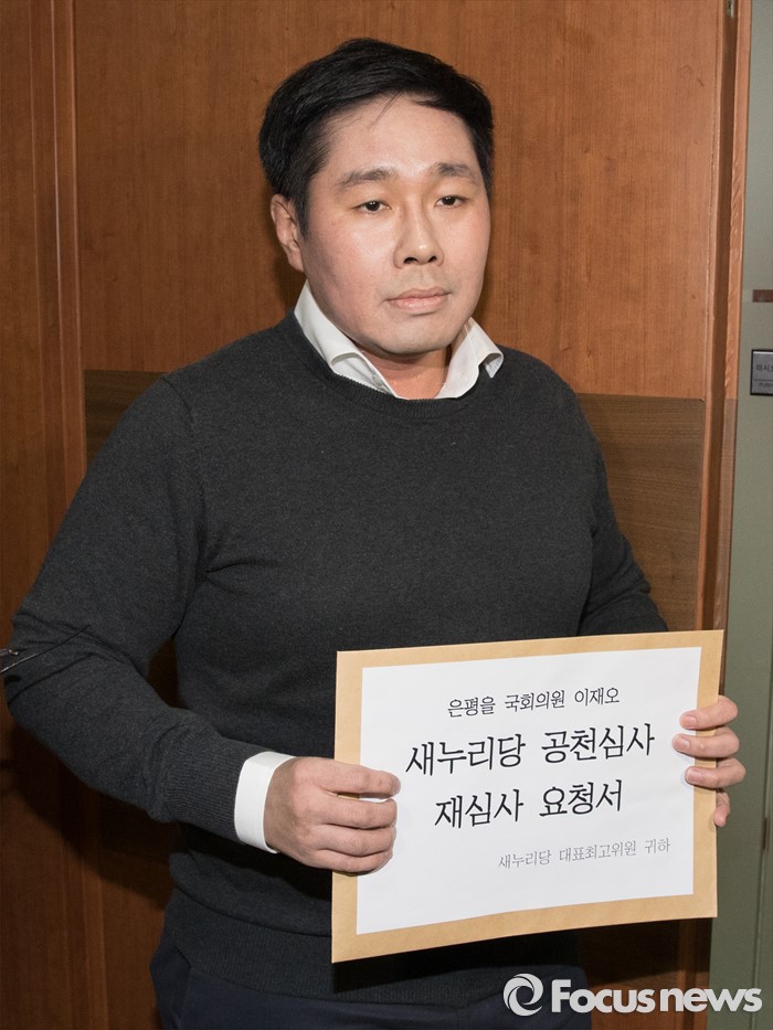 (서울=포커스뉴스) 19일 오후 서울 영등포구 새누리당사로 이재오 의원측 보좌관이 공천심사 재심사 요청서를 제출하기 위해 방문, 취재진을 향해 들어보고 있다.