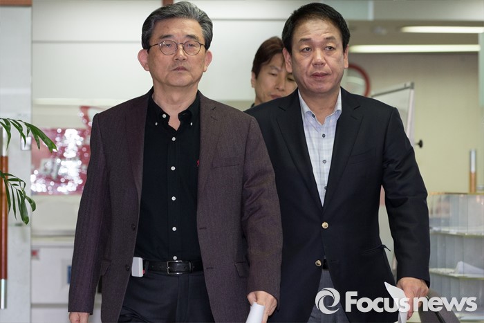 | △ 결과 발표 위해 이동하는 이한구·박종희 |