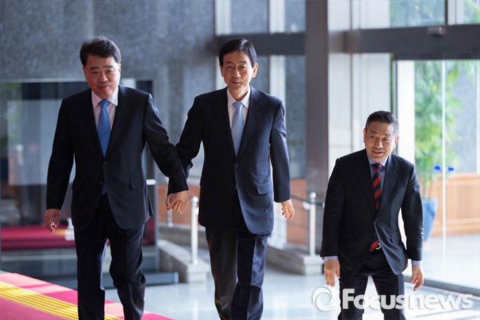 (서울=포커스뉴스) 새누리당 공천에서 배제된 뒤 탈당한 진영 의원이 20일 오전 서울 여의도 국회에서 더불어민주당 공식 입당을 알리는 기자회견을 하기 위해 김성수 더민주 대변인의 손을 붙잡고 기자회견장으로 향하고 있다.