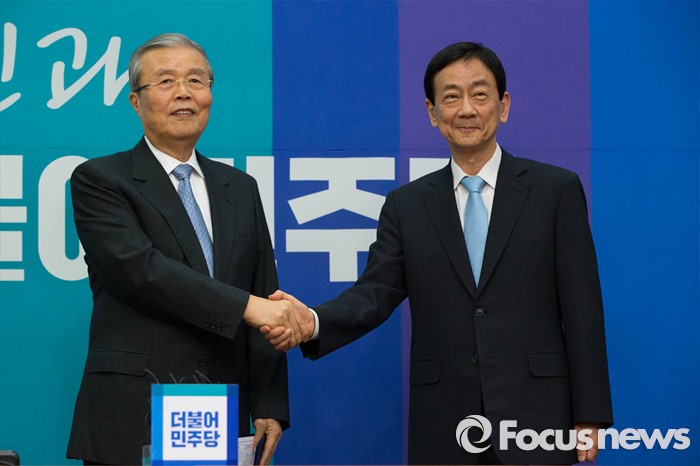 (서울=포커스뉴스) 새누리당에서 공천 배제된 뒤 탈당한 진영 의원이 20일 오전 서울 여의도 국회에서 열린 더불어민주당 공식 입당을 알리는 기자회견에서 김종인 더민주 비례대표와 악수를 하고 있다.