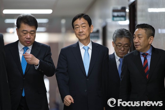(서울=포커스뉴스) 새누리당 공천에서 배제된 뒤 탈당한 진영(가운데) 의원이 20일 오전 서울 여의도 국회에서 더불어민주당 공식 입당을 알리는 기자회견을 하기 위해 기자회견장으로 향하고 있다.