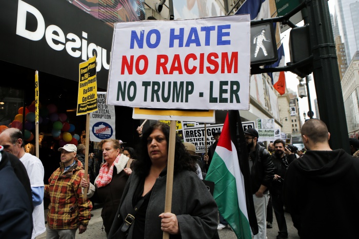 이들은 정오 무렵 맨해튼 남부 센트럴 파크의 '콜럼버스 서클'에 모여서 '사랑이 증오를 이긴다', '트럼프 한 명과 난민 2만5천 명을 맞바꿀 것인가' 등의 구호가 적힌 현수막을 들고 "도널드 트럼프, 인종차별, 성차별, 반동성애, 물러나라"라고 외쳤다. 이후 트럼프가 살고 있는 5번가 '트럼프 타워'까지 행진을 벌였다.