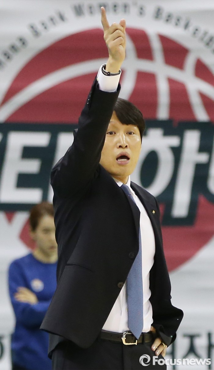 (부천=포커스뉴스) 20일 부천체육관에서 열린 2015-2016 여자프로농구 챔피언결전전 3차전 KEB하나은행-우리은행 경기에서 우리은행 위성우 감독이 손가락을 펴 보이며 작전을 지시하고 있다.