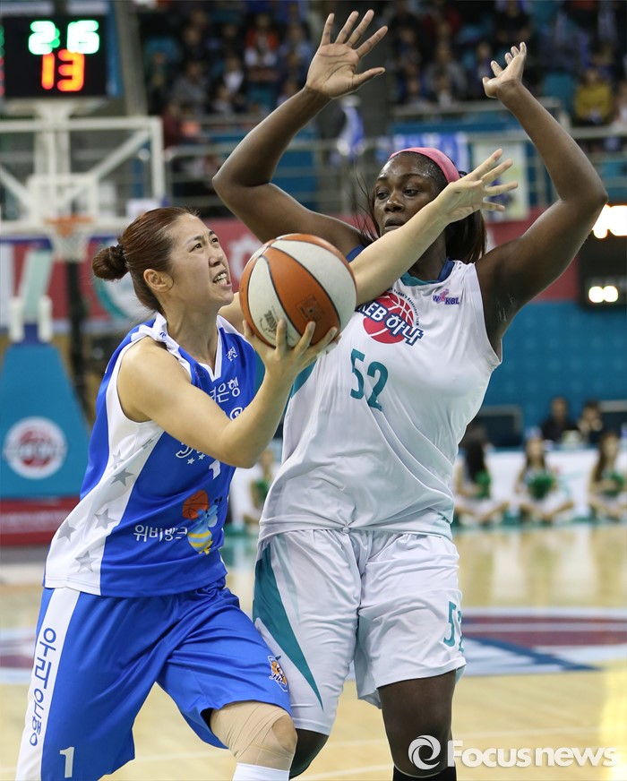 (부천=포커스뉴스) 20일 부천체육관에서 열린 2015-2016 여자프로농구 챔피언결전전 3차전 KEB하나은행-우리은행 경기에서 우리은행 양지희가 KEB하나 첼시 리의 마크를 제치며 레이업슛을 시도하고 있다.