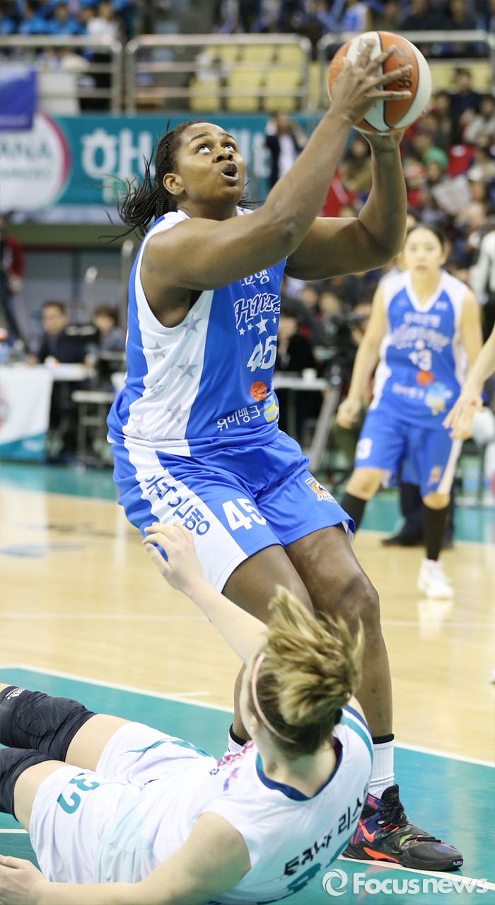 (부천=포커스뉴스) 20일 부천체육관에서 열린 2015-2016 여자프로농구 챔피언결전전 3차전 KEB하나은행-우리은행 경기에서 우리은행 굿렛이 KEB하나 리스턴을 제치고 골밑슛을 노리고 있다.