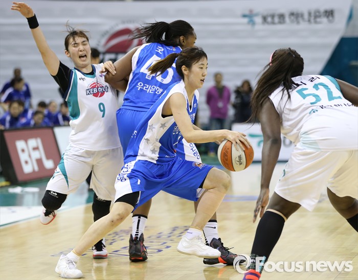 (부천=포커스뉴스) 20일 부천체육관에서 열린 2015-2016 여자프로농구 챔피언결전전 3차전 KEB하나은행-우리은행 경기에서 우리은행 굿렛이 KEB하나 백지은을 막는 사이 박혜진이 돌파를 시도하고 있다.