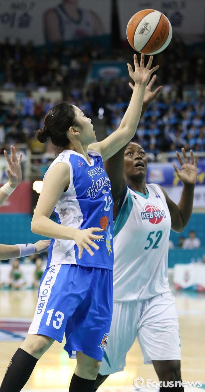 (부천=포커스뉴스) 20일 부천체육관에서 열린 2015-2016 여자프로농구 챔피언결전전 3차전 KEB하나은행-우리은행 경기에서 우리은행 이승아가 KEB하나 첼시 리의 블록을 피하며 레이업슛을 시도하고 있다.