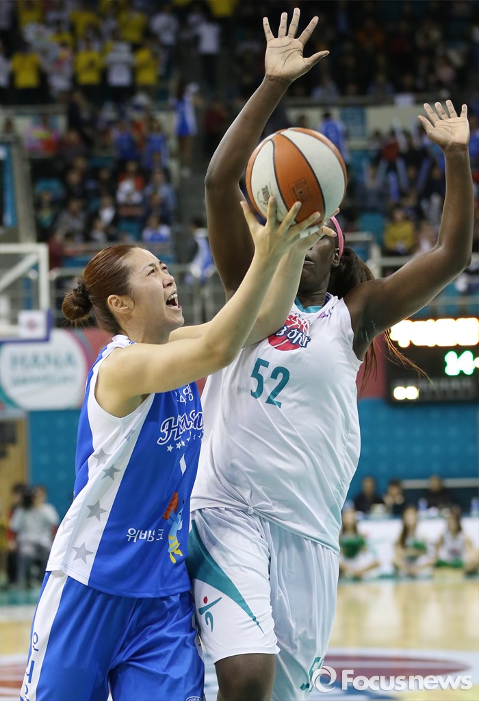 (부천=포커스뉴스) 20일 부천체육관에서 열린 2015-2016 여자프로농구 챔피언결전전 3차전 KEB하나은행-우리은행 경기에서 우리은행 양지희가 KEB하나 첼시 리의 마크를 제치며 레이업슛을 시도하고 있다.