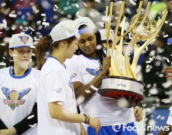 (부천=포커스뉴스) 20일 부천체육관에서 열린 2015-2016 여자프로농구 챔피언결정전 3차전에서 승리하며 KEB하나에게 3승으로 통합챔피언을 차지한 우리은행 양지희와 굿렛이 우승 트로피를 보고 있다. 뒤는 전주원 코치.