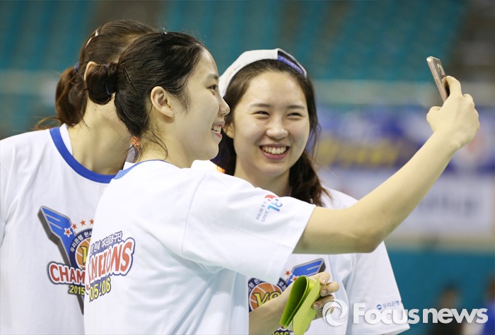 (부천=포커스뉴스) 20일 부천체육관에서 열린 2015-2016 여자프로농구 챔피언결정전 3차전에서 KEB하나은행을 물리치고 3승으로 통합 챔피언을 차지한 우리은행 이승아가 동료들과 셀카를 찍고 있다.