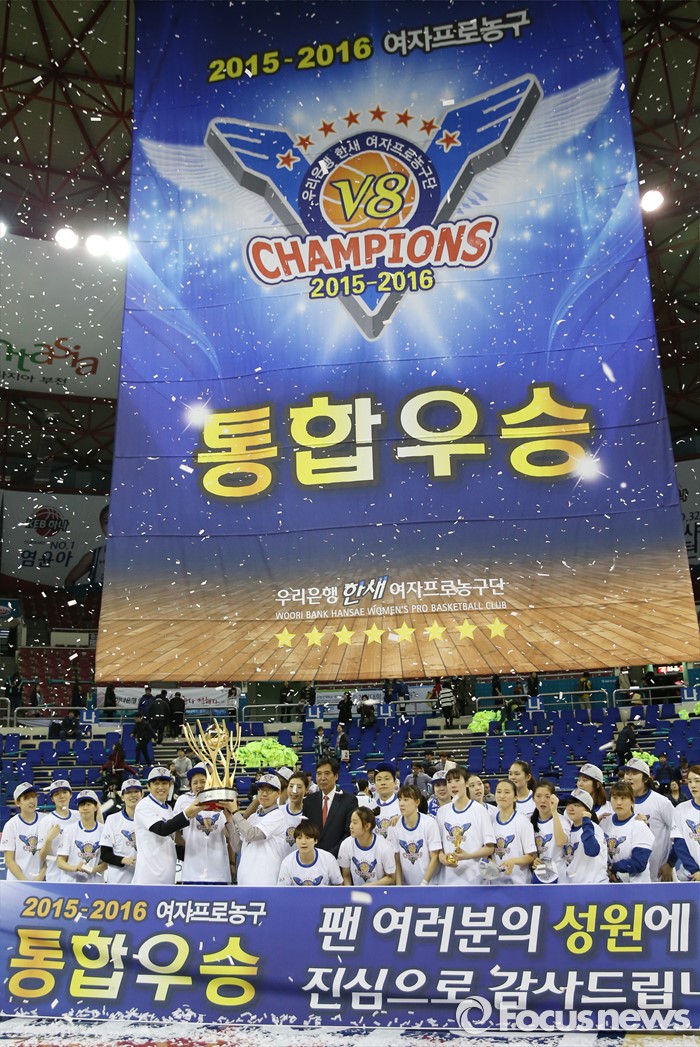 (부천=포커스뉴스) 20일 부천체육관에서 열린 2015-2016 여자프로농구 챔피언결정전 3차전에서 KEB하나은행을 물리치고 3승으로 통합 우승을 차지한 우리은행 선수들이 트로피를 들고 기념사진을 찍고 있다.