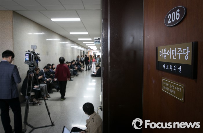 (서울=포커스뉴스) 21일 오전 서울 여의도 국회 더불어민주당 대표회의실에서 취재진이 비공개 회의가 끝나기를 기다리고 있다. '셀프 공천' 논란을 받고 있는 김종인 비대위 대표는 이날 회의에 불참했다.