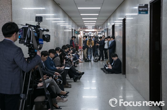 (서울=포커스뉴스) 21일 오전 서울 여의도 국회 더불어민주당 대표회의실에서 취재진이 비공개 회의가 끝나기를 기다리고 있다. '셀프 공천' 논란을 받고 있는 김종인 비대위 대표는 이날 회의에 불참했다.