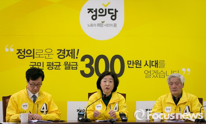 (서울=포커스뉴스) 심상정 정의당 상임선대위원장이 21일 오전 서울 여의도 국회에서 열린 중앙선대위 1차 회의에 참석해 모두발언을 하고 있다. 왼쪽부터 천호선 공동선대위원장, 심 위원장, 김세균 공동선대위원장.