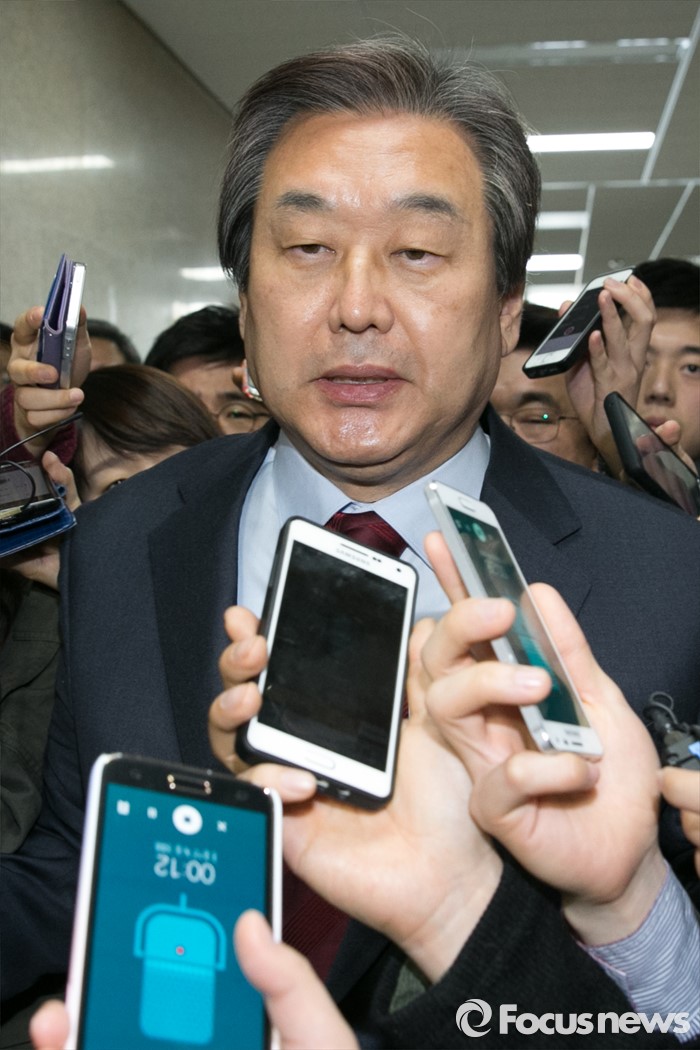 (서울=포커스뉴스) 김무성 새누리당 대표가 21일 오전 서울 여의도 국회에서 열린 최고위원회를 마친 뒤, 기자들의 질문을 들으며 밖으로 나가고 있다.