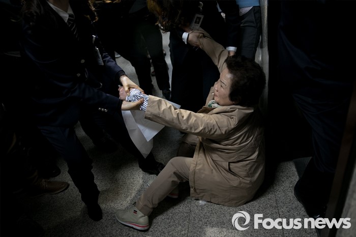 | △ 항의 중 끌려나가는 더민주 전국실버위 당원 |