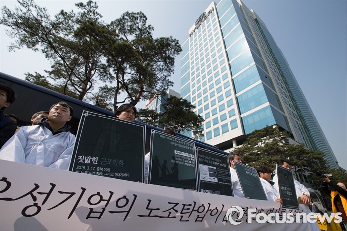 (서울=포커스뉴스) 21일 오전 서울 서초구 현대자동차 본사에서 유성기업 공대위와 시민사회단체 회원들이 유성기업 故 한광호 사망 현대자동차 규탄 기자회견을 하고 있다.