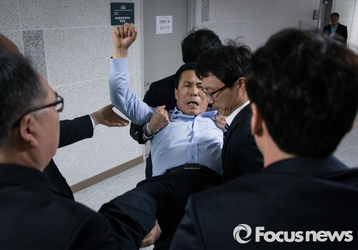 (서울=포커스뉴스) 21일 오전 서울 여의도 국회 의원회관에서 열린 국민의당 최고위원회의장 앞에서 김재원 후보측 김승식 선대위원장이 박준영 전 전남지사 전략공천에 항의하다 경위들에 의해 끌려나가고 있다.