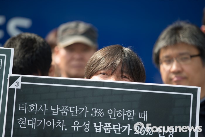 (서울=포커스뉴스) 21일 오전 서울 서초구 현대자동차 본사에서 열린 유성기업 故 한광호 사망 현대자동차 규탄 기자회견에서 유성기업 공대위와 시민사회단체들이 피켓을 들고 있다.