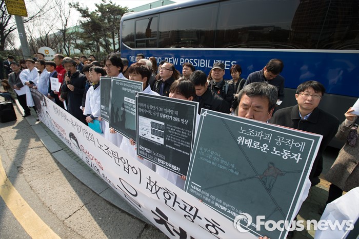 (서울=포커스뉴스) 21일 오전 서울 서초구 현대자동차 본사에서 유성기업 공대위와 시민사회단체 회원들이 유성기업 故 한광호 사망 현대자동차 규탄 기자회견을 하고 있다.