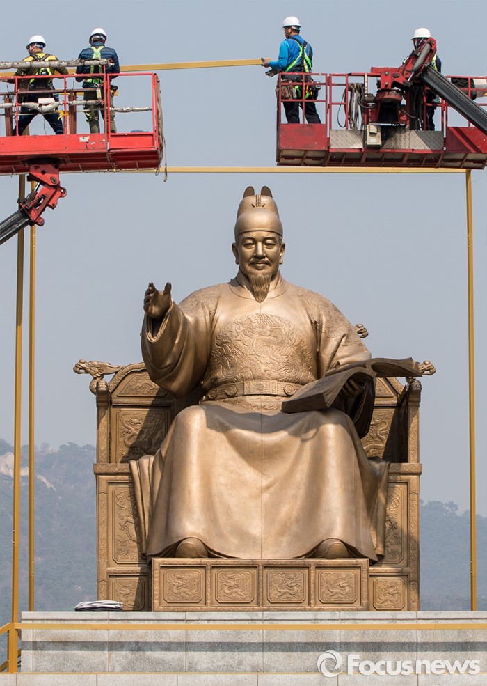 (서울=포커스뉴스) 21일 오전 서울 광화문 광장 세종대왕상에 한ㆍ불수교 130주년 기념 미술작품 '킹 오브 사인스'가 설치되고 있다.